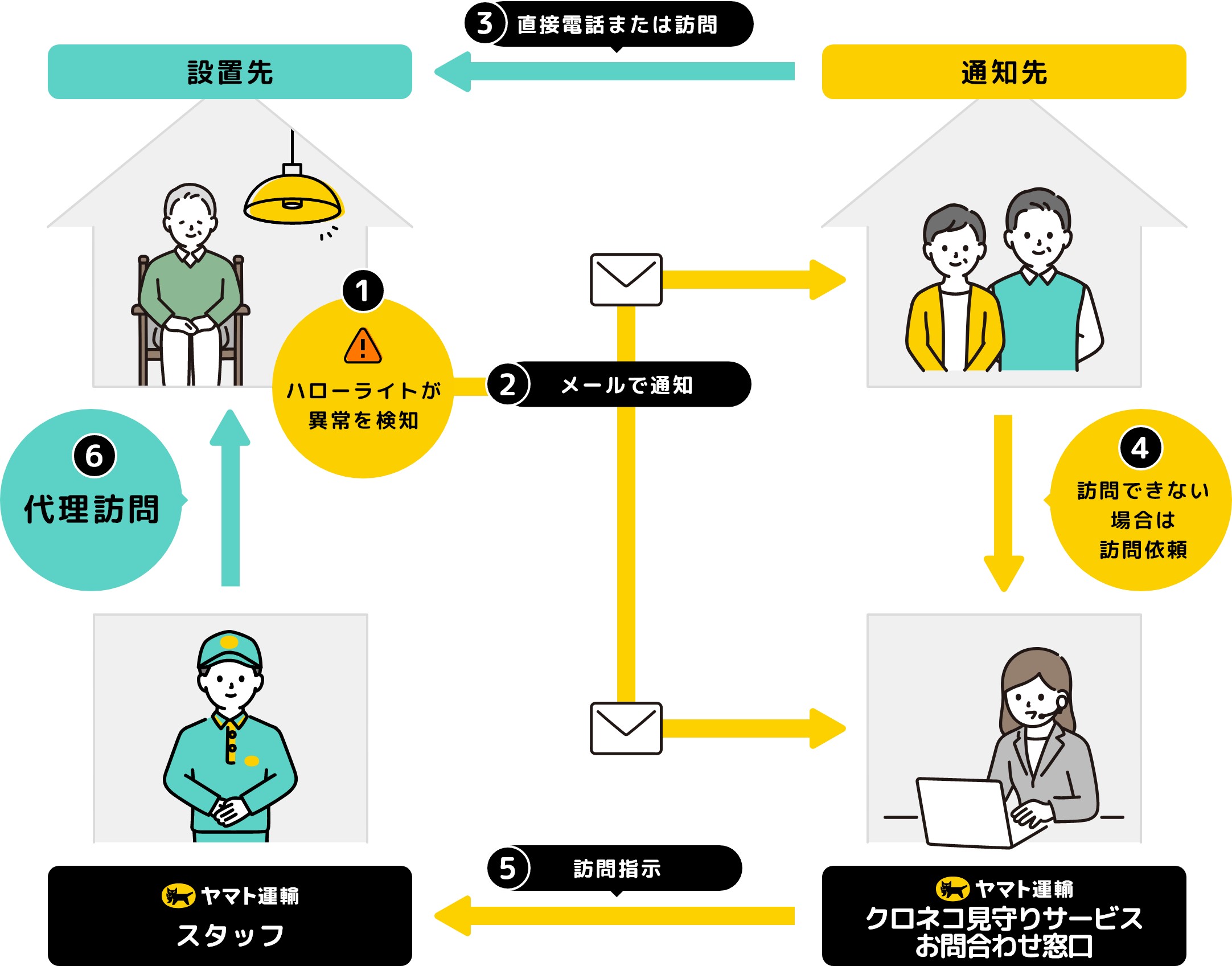訪問依頼をするとヤマト運輸のスタッフが代わりに自宅を訪問し状況を確認後、必要に応じて地域包括支援センター等の地域の窓口に通報されます。